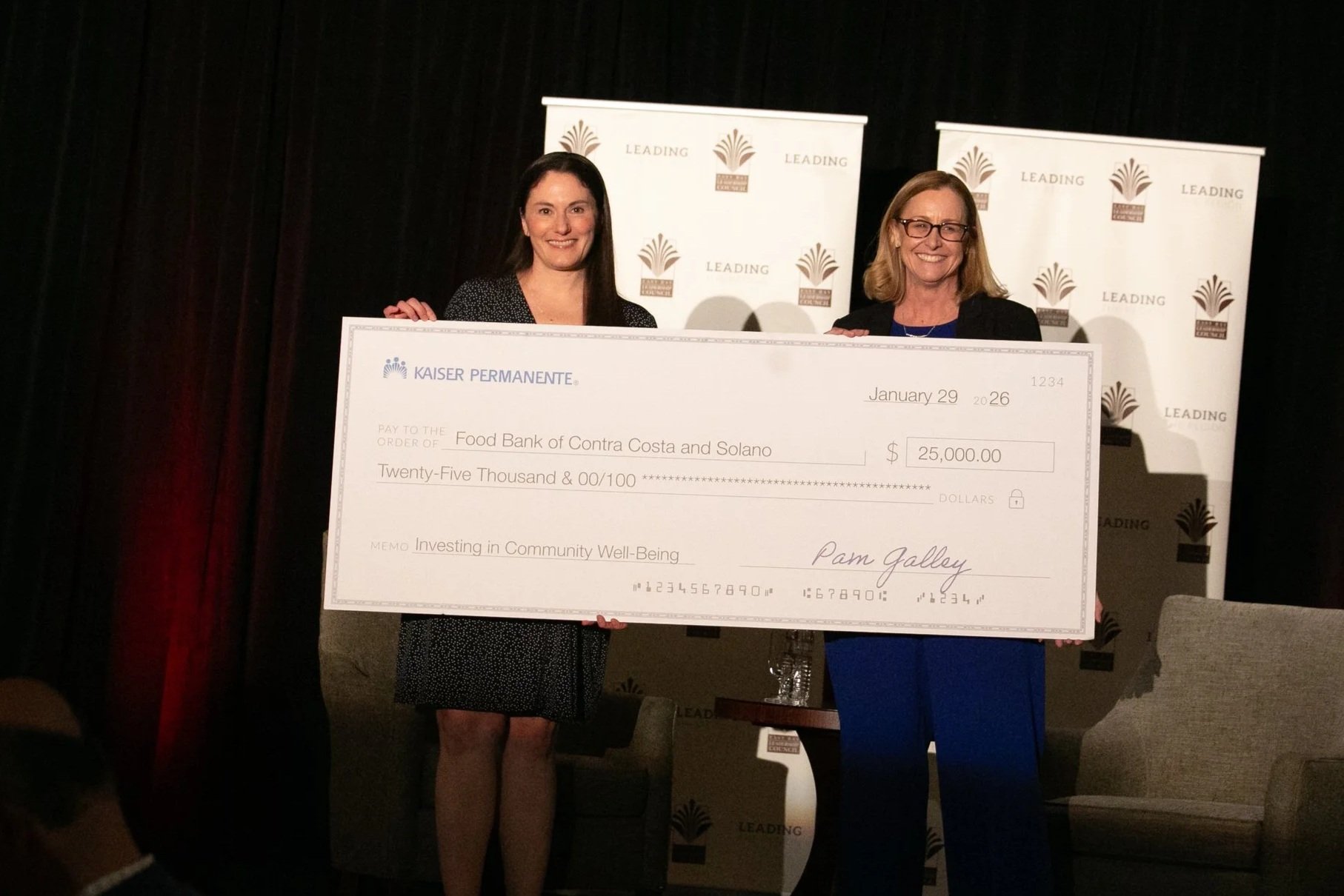 Pam Galley (right), Senior Vise President & Area Manager for Kaiser Permanente’s Diablo Service Area, and Caitlin Sly (left) CEO of the Food Bank of Contra Costa & Solano pose with donation check.